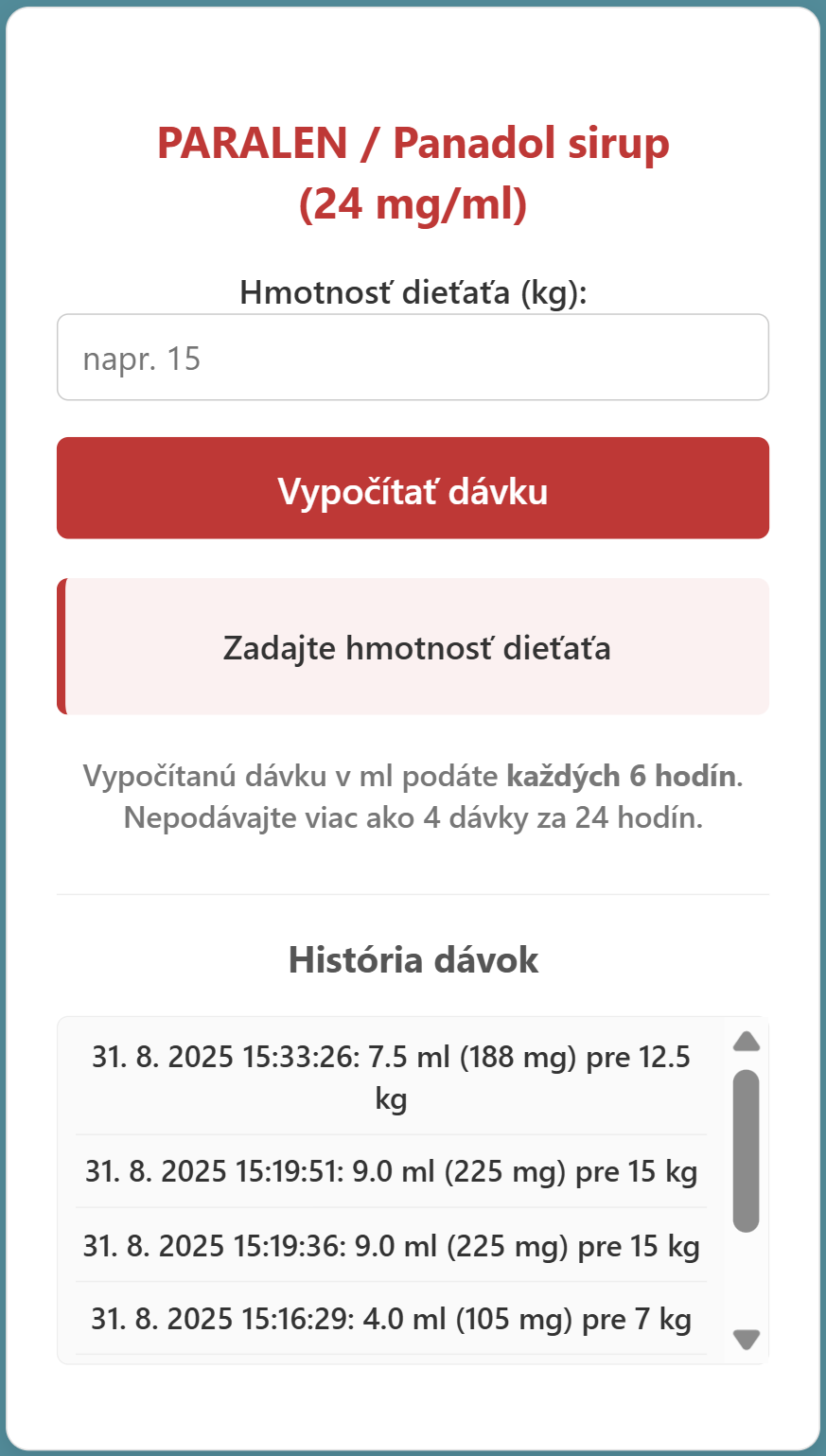 ✓ všetky dávkovacie kalkulačky (čapíky, sirupy, Fenistil kv., rehydratačné roztoky)